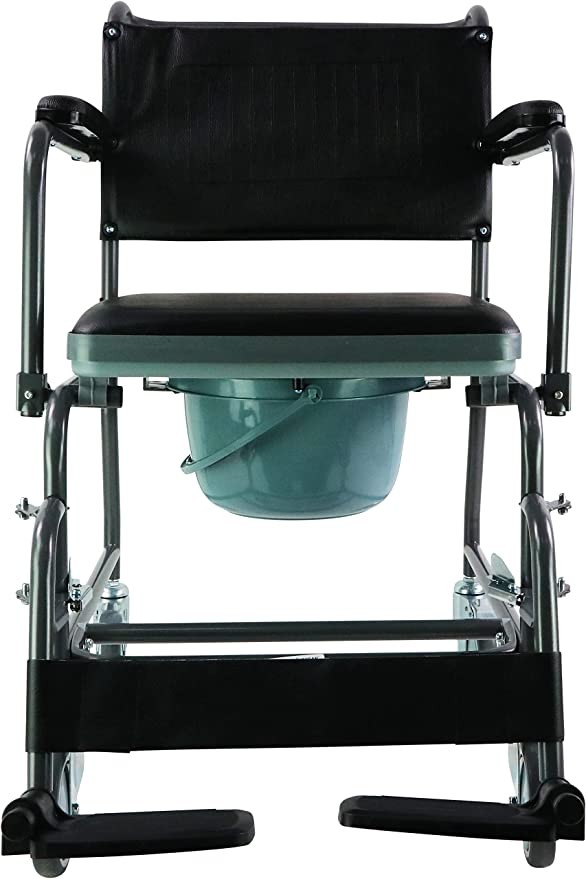Aidapt wheeled mobile Commode toilet chair with padded back, drop arm support and removable upholstered seat, locking casters, large removable bucket and swing footrest.