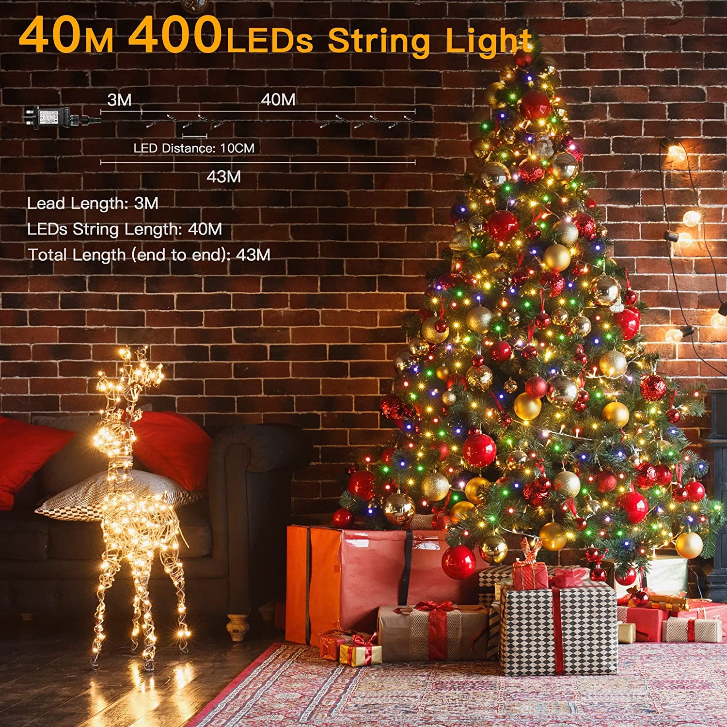 • 【40m 400LED Christmas Fairy Lights】Ollny string led lights with a length of 40m (131ft), lead length of 3m (9.8ft), total length is 43m, and the lamp spacing 0.1m (0.33ft). They are long enough to light up the front of your house at Christmas and give a wonderful sense of welcome as family and friends come to visit. Dark cables will help to blend them better into most outdoor backdrops and Christmas trees, leaving only glittering lights in the dark